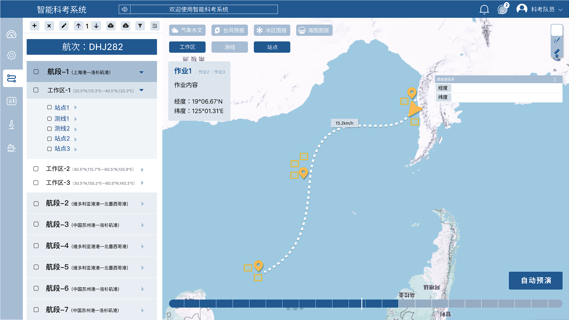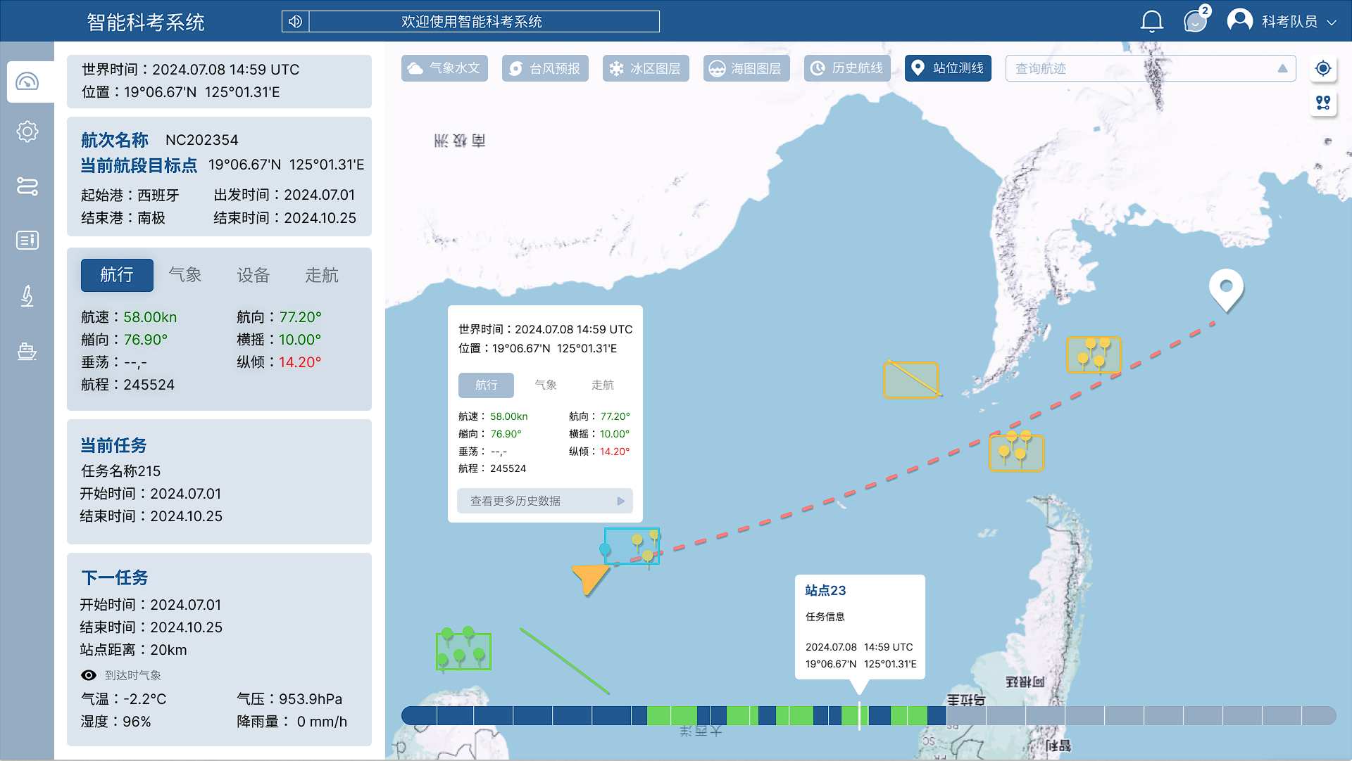 航次规划: 结合气象、海况、冰情等实时数据,利用智能算法为航次制定最优路线和科考方案,提高航次效率和安全性;