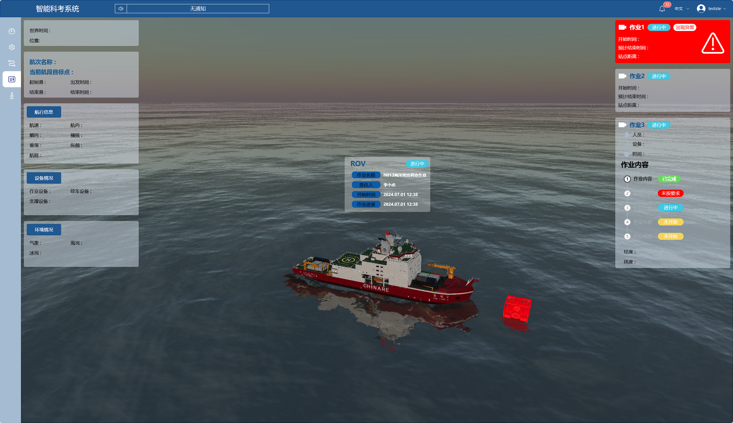 航渡日常监控: 对船舶航行状态、设备运行情况、实验室环境等进行实时监控,及时发现和处理异常情况,确保航次安全和科考工作顺利进行;
