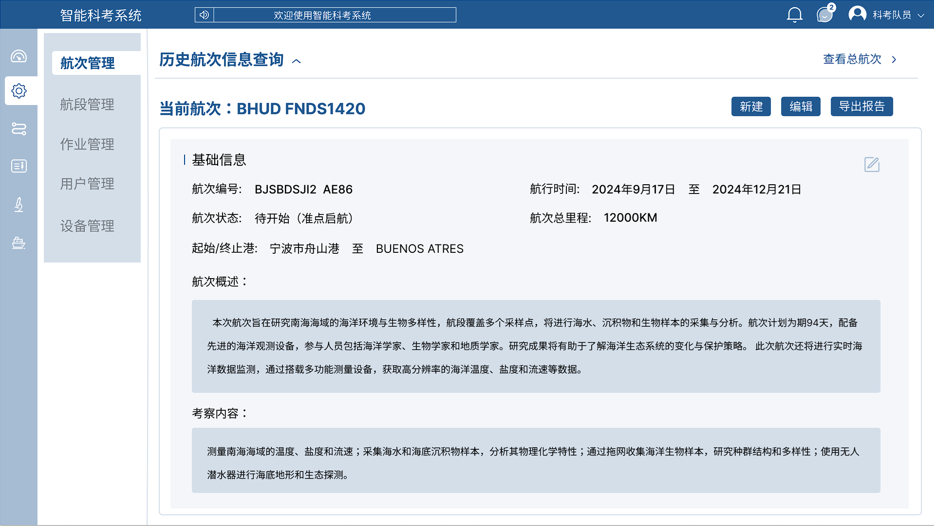 航次管理: 实现对航次信息的集中管理,包括航次计划、人员信息、物资装备、科考任务等内容,方便科考人员快速查询和调用相关信息;