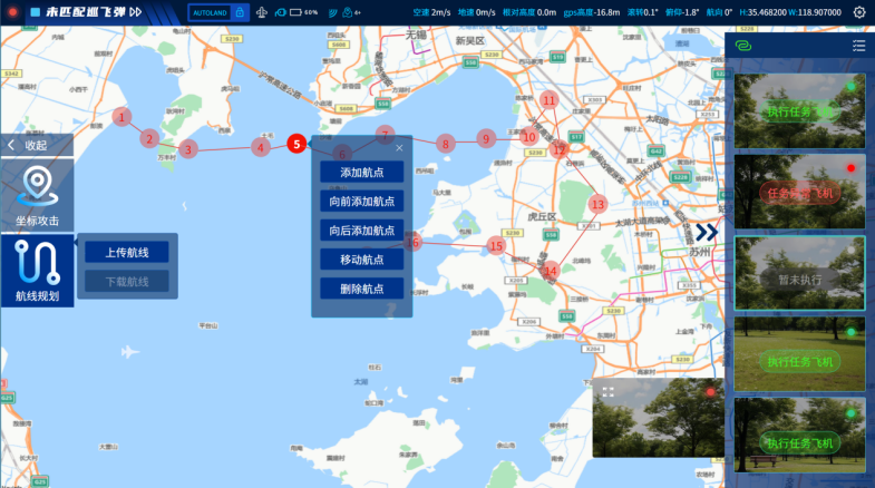 航空巡飞弹地面站控制系统的主界面,可直观展示巡飞弹的空速、地速、高度、坐标等实时飞行状态;右侧分栏显示多架巡飞弹的任务状态(执行任务 / 任务异常 / 暂未执行)与实时画面,底部提示当前设备连接状态,整体用于巡飞弹的任务监控、可视化操作与全流程管理。