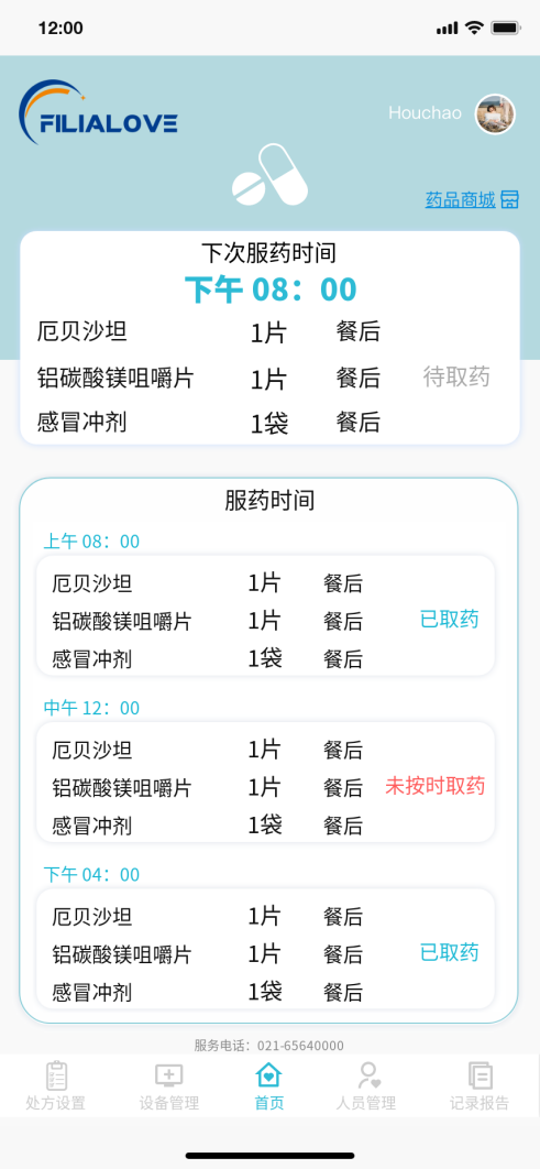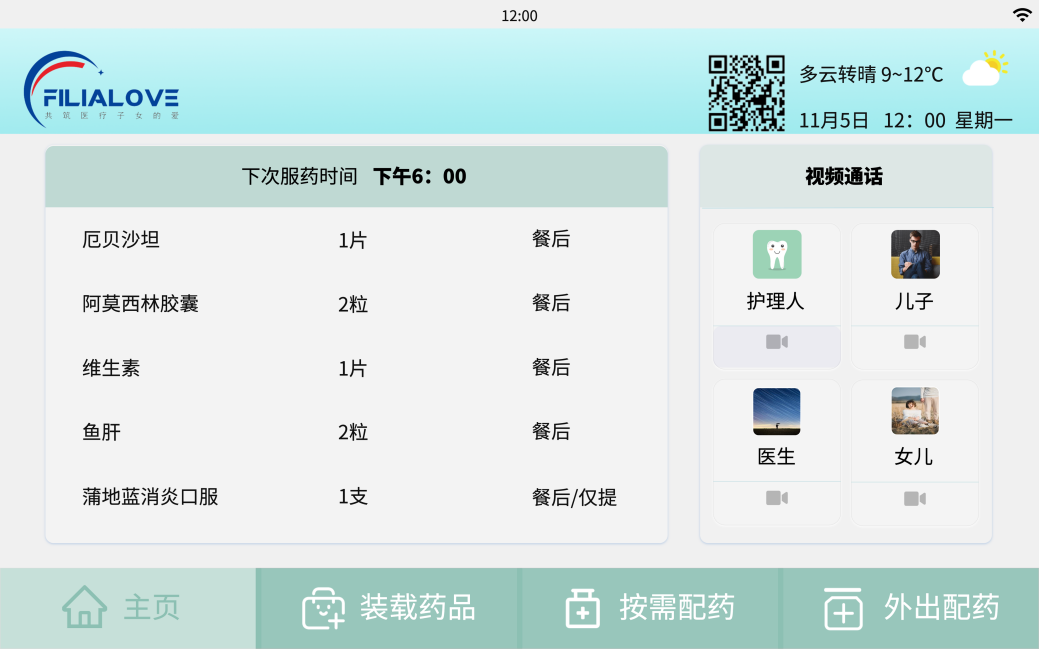 解决方案:通过配药设备、设备管理后台和微信小程序开发,根据医生配置药量种类、数量以及时间,实现处方管理、吃药提醒、缺药预警、视频通话、在线购药等功能。
